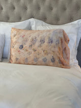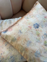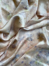 Naturally Hand Dyed with a proprietary blend of plant dyes and flowers. Peachy background with layers of purple, blue, pink and yellow flower petals create unique markings throughout. All flowers gathered right from the Aurora Sage Los Angeles garden!