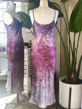 Naturally hand dyed with a proprietary blend of plant dyes and many layers of flower petals from the Aurora Sage garden creating a dreamy celestial landscape. Deep purples, pinks, and subtle lighter shades of swirling colors blend into each other like clouds in space.