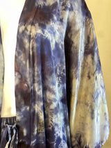 Hand-dyed through an alchemical process of plant and mineral pigments, the Midnight Nova Duster evokes the quiet radiance of a night sky just before dawn, deep indigo layered with bronze and gold veining like scattered constellations. Fluid, luminous, and endlessly versatile, it can be worn open or belted, layered or alone - a piece of the cosmos in motion. Pair with matching Dharma pant to wear as a set.