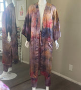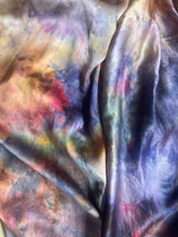 These silk pants feel like a twilight dream; molten, mystical, and prismatic. The colors ripple like dusk over water or smoke catching sunset light: plum, indigo, rose, ember, gold. There’s something ancient and celestial about it, as if it were painted by stardust and fire. No two are ever the same, each pair tells its own unique elemental story.