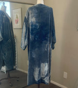A draped sea of deep indigo and silvery mist, this velvet duster flows like ocean fog over moonlit rocks. This piece is hand-dyed to evoke a sense of worn in magic; earthy, mysterious, and soft to the touch. Wear duster with the Velvet or reversible silk side out. Designed for slow mornings, sacred rituals, or slipping into your most cinematic self.