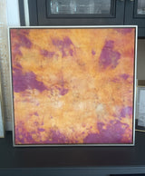 A framed silk artwork in saturated tones of golden ochre and bruised hot violet, created through a proprietary botanical dye process. The surface pulses with texture and color, a collision of softness and saturation, like the skin of overripe fruit just giving way.
